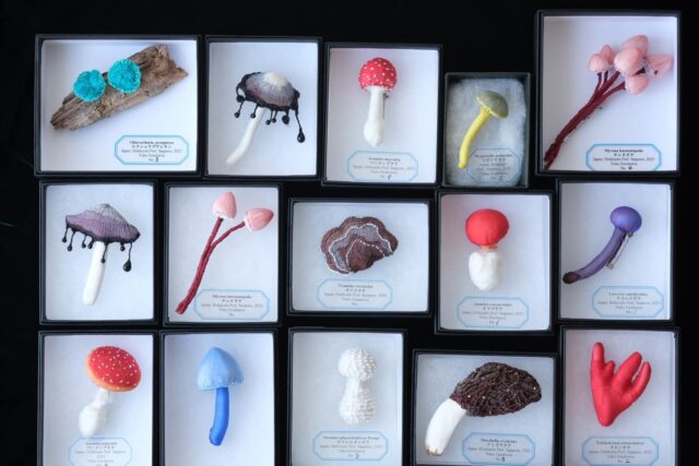 数年前からは標本のシリーズに着手、世界にはまだまだ知らない素晴らしい生き物がいることを知り創作意欲が膨らみました。昨年は森でのきのこ観察を教わってきのこのシリーズを制作。でも、せっかく生きているみたいに作ったきのこを標本の形で並べた時に違和感を持ちました。それは、せっかく誕生させたものを殺さなければいけない悲しみであり、例えるなら自分自身を標本にされる感覚であり、科学や理屈では割り切れない感情なのだと分かりました。